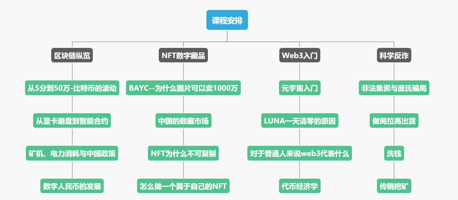活动面向全校招募20名主讲人,依托繁星区块链专业团队的五名指导人员,进行了培训和主讲课程的录制工作,支教的主题是区块链的入门与热点,确定了四个大类:区块链纵览(5门)、NFT数字藏品(3门)、Web3入门(3门)、科学反诈(3门)。