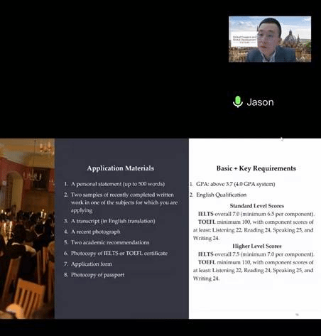 在这之后陆博士为同学们介绍了牛津大学的录取标准,其中包括牛津大学对于标化考试成绩的要求,并且陆博士强调了同学们需要提升自身软背景的核心竞争力。
