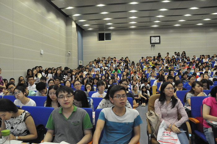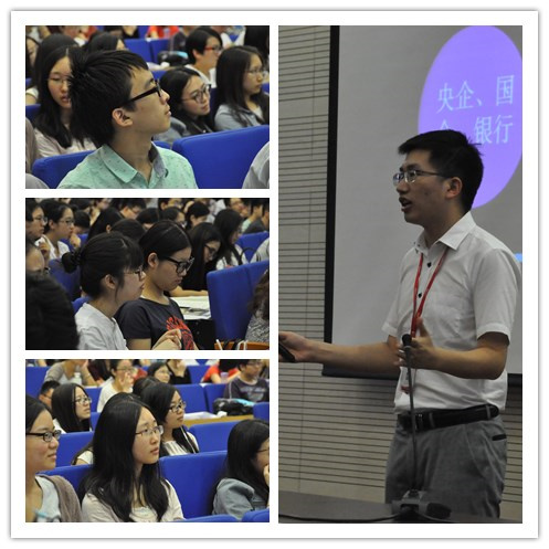不到6点半,能容纳300余人的报告厅已座无虚席。在近两个小时的时间里,韩强老师首先从毕业生的就业选择开始,对北京高校报考银行的情况进行了介绍;接着韩老师对银行职业稳定、收入颇高、相对自由的工作特点作了阐述;随后重点讲解了银行的招聘流程,对银行招考报名、笔试、面试等环节的诸多细节和经验做了剖析。