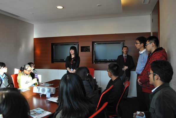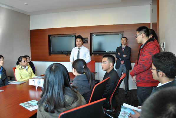 同学们进入法兴银行后,来到一个18层会议室。女职员April首先为大家简单介绍了银行的分类和法兴银行的主要经营范围,让原本有些拘谨的同学们放松了许多。接着,刚毕业不久进入法兴银行的王正央给大家讲了自己的一些心得体会。他认为老员工在大学中一定要加入适合自己的社团组织,要精而不能泛,这样个人能力才能得到提高;并且每个人一定要尽快找准自己的定位,明确自己毕业后的发展方向。他精彩的讲解得到了大家热烈的掌声。