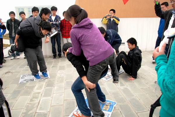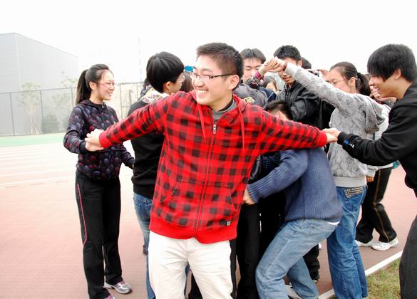 弥谩瘴雾何所惧,北上抗日志更坚,“坐地起”,怎奈何我金融学子,一蹴而就迎胜利。人语马啸西风劲,露洗湿衣成冰瓜,“绑腿跑”,纵使秋风瑟瑟起,满怀激情,号声嘹亮,手挽手,心齐心。在历时一个多小时后,“长征队伍”迎来了他们倒数第二个任务---翻报纸。这不仅要求同学间要有极高的默契,而且考验了同学们的智慧。同学们集思广益,纷纷开动脑筋,在不断地尝试后,终于找到了完成任务的诀窍。长征路逐渐接近了尾声,回到足球场上,辛苦的战士们面临着他们的最后一项任务---解手链。大家协力齐心,以完美的结局为整个“长征路”画上了句号。