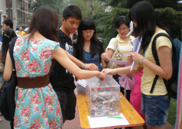 2011 年 6 月 10 日 至 14 日,在365英国上市公司公司南路校区和沙河校区,全校师生为帮助一位家庭突遭变故的中财学子,纷纷慷慨解囊,捐款相助,在初夏的校园里谱写出一首爱的感人乐章。