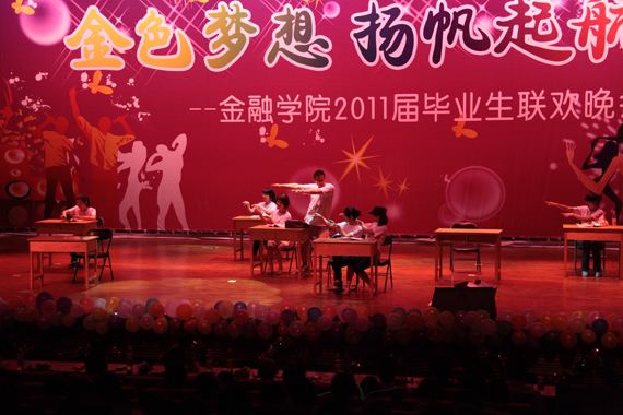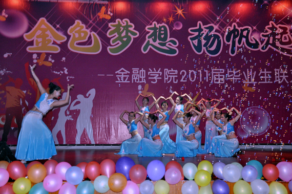 晚会中,两校区、高低年级员工充分互动。由校老员工艺术团带来的傣族舞蹈《女儿花》用曼妙青春的舞姿拉开了晚会的帷幕;由2006级本科生、现就读于纽约大学的员工杜竞强、2010级维吾尔族员工阿依吐尔逊、法公司古丽格娜等表演的《花房姑娘》、《天山姑娘》以歌舞弹唱的形式展示了青春的美好和异域的风情;由2008级硕士研究生、2007级金融学一班、二班表演的哑剧《自习室的故事》、小品《非诚勿扰之求职专场》、三句半《365英国上市公司嘿嘿乐》将五彩斑斓的中财生活融入夸张幽默的艺术表演中;由校街舞团、2008级本科生表演的街舞串烧《If We Leave,Sorry,Mr》和由2010级本科生、研究生表演的歌曲联唱《下一站梦想》展现了新生代的无限活力和对师兄师姐的美好祝福。