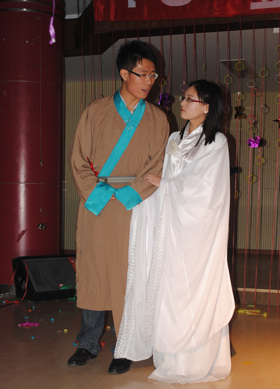 迎新晚会在活力四射的动感歌舞《热火青春》中拉开了帷幕,带动起了全场同学的热情,点燃了现场的气氛。随后,同学们纷纷登台献上了丰富多彩、形式新颖的精彩节目。其中有婉转优美的男女对唱《 start of something new 》、《陷入爱里面》;有充满浓郁民族风情的维吾尔族舞蹈《美丽的小姑娘》;有舒缓悠扬的钢琴小提琴合奏《卡农》;有轻松活泼的舞台剧表演《记忆中的爱情故事》;有清新悠扬的钢琴伴唱《爱情转移》,有青春飞扬的合唱《奔跑》、《 when you believe 》 …… 同学们的精彩表演引来了观众们阵阵的掌声和欢呼声。在晚会进行过程中,葛仁霞书记还为同学们带来了一曲清唱《我与草原有个约定》。葛书记清新亮丽的声音博得了同学们的阵阵喝彩,将晚会的气氛推向了高潮。