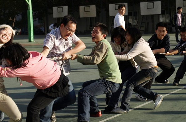 拔河比赛是最后一个项目。男生和女生均匀地分成两队,进行了三个回合的比赛,大家都全力以赴,周围的加油声不断,整个活动达到了高潮。