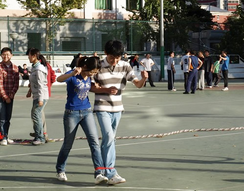 随后进行了“绑脚跑”比赛。两个人自愿组队,分别将一只脚绑在一起,三组是一队,在 3 分钟内接力跑,回合数最多的那队获胜。比赛进行的很激烈,也很好看,大家的掌声和尖叫声不断。