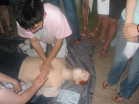 此次培训第一天由主办方请来北京市红十字会的教员讲解关于急救的理论知识,主要包括如何替伤者进行人工呼吸、正确的伤口包扎方法、运送伤员时应注意的具体事项以及对小伤事故的正确处理等等。第二天老师们配合道具给同学们示范具体的操作方法以及步骤,并给同学们实际演练前一天所授课内容的机会。由于道具数量有限,同学们就每一个培训项目交互模拟作为伤者和救护者的过程进行练习,整个培训在愉快而融洽的氛围中完满结束。培训之后通过考核的同学可以获得急救初级证书。此次培训活动共有 150人左右参加。