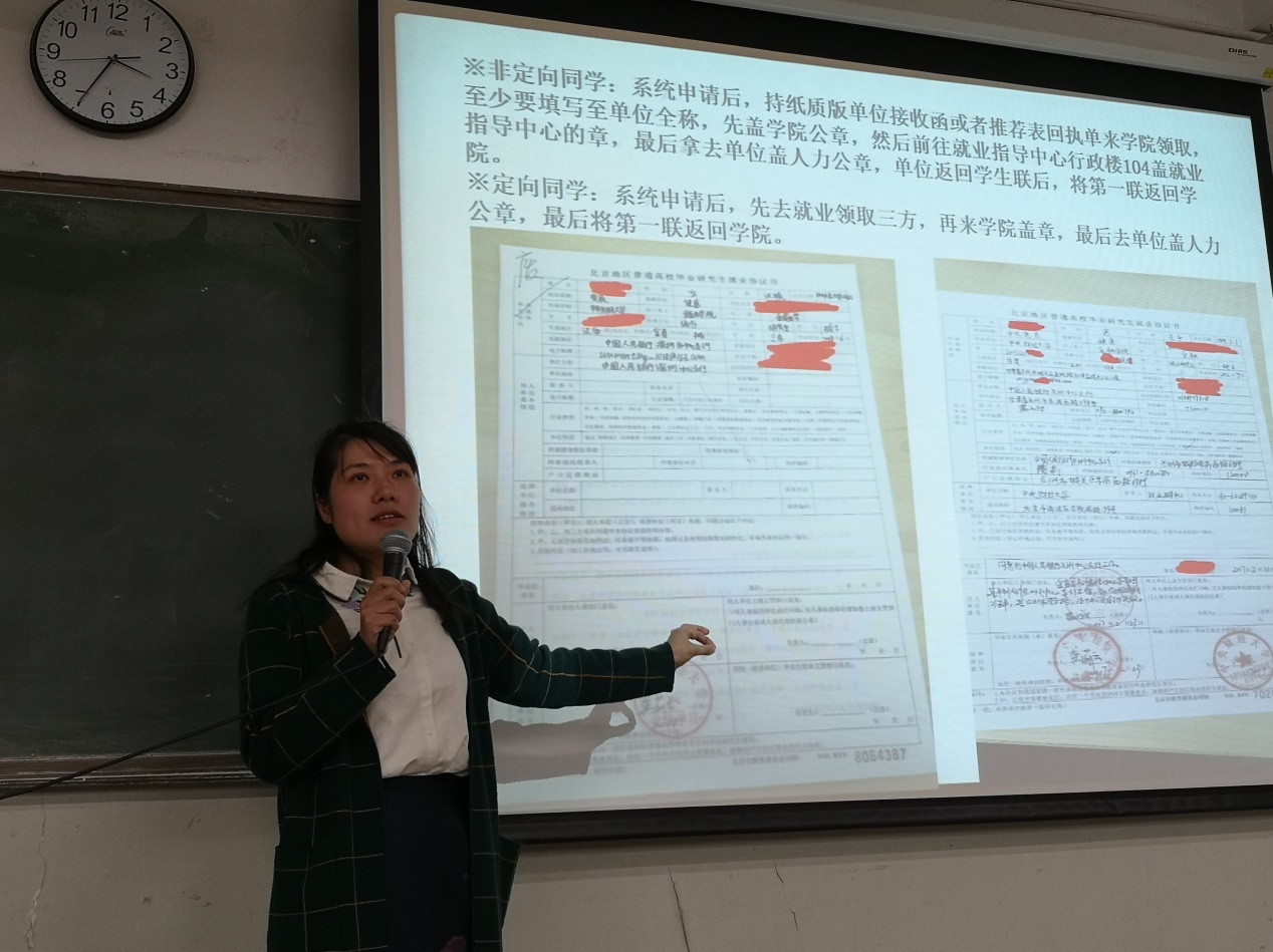 为帮助毕业生更好的了解就业流程及业务的办理,由公司职业发展中心主办、研究生会职业发展部承办的职业发展系列讲座(十二)——2019届毕业生三方签约说明及就业政策业务解读大会分别在10月24日公司南路校区和10月26日沙河校区举办。职业发展中心老师位锦及公司近200位2019届硕博毕业生共同参加,公司研究生工作办公室2019届毕业生辅导员龚莉云作为此次活动的主讲嘉宾。