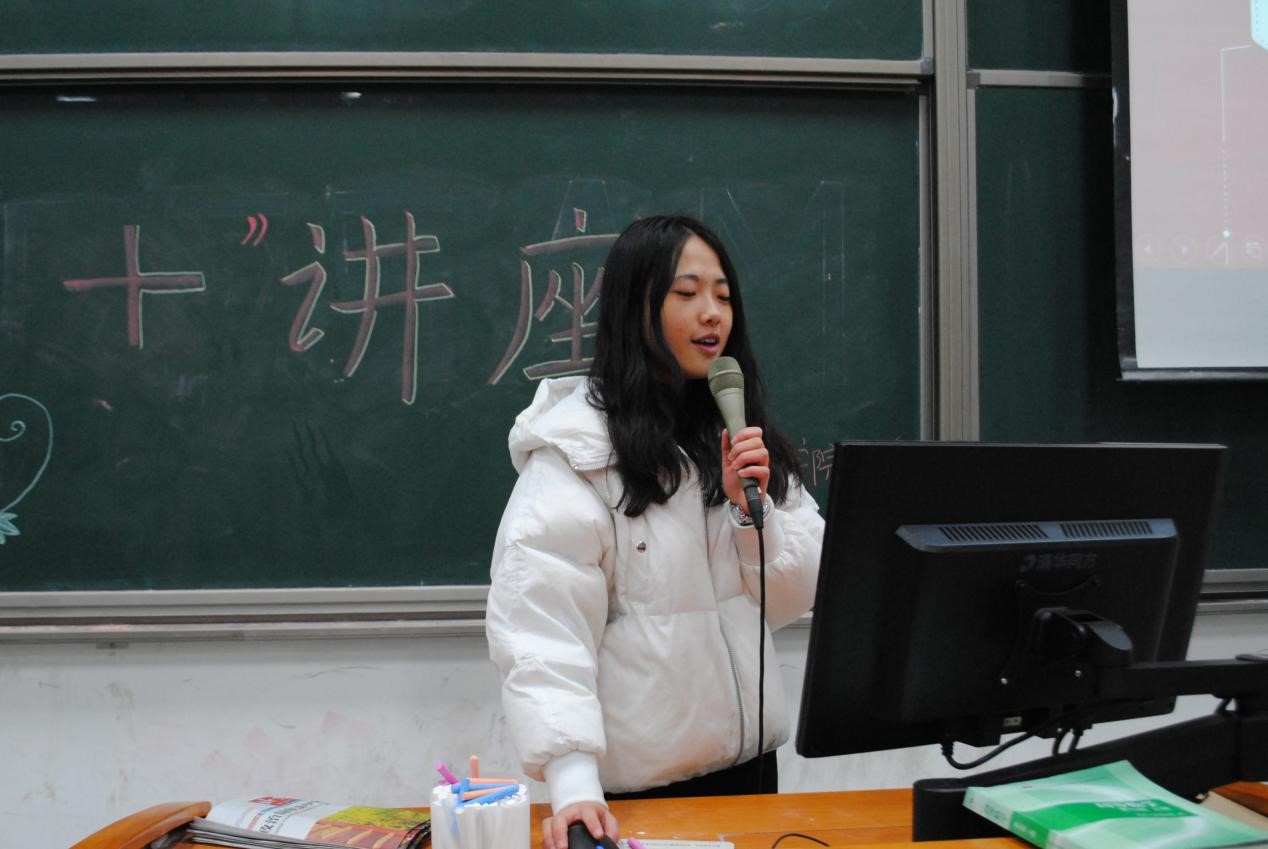 讲座接近尾声,国际金融的“芮+”导师郭嘉晏学姐上台分享作为‘芮+’导师的心理、体验与收获。学姐谆谆善诱,从如何面试、如何协调工作与学习生活、如何高效和员工工作的意义与收获等问题层层展开,最后更以“团史团情,井冈山实践分享”的经历精彩收尾,赢得在场同学的热烈掌声。