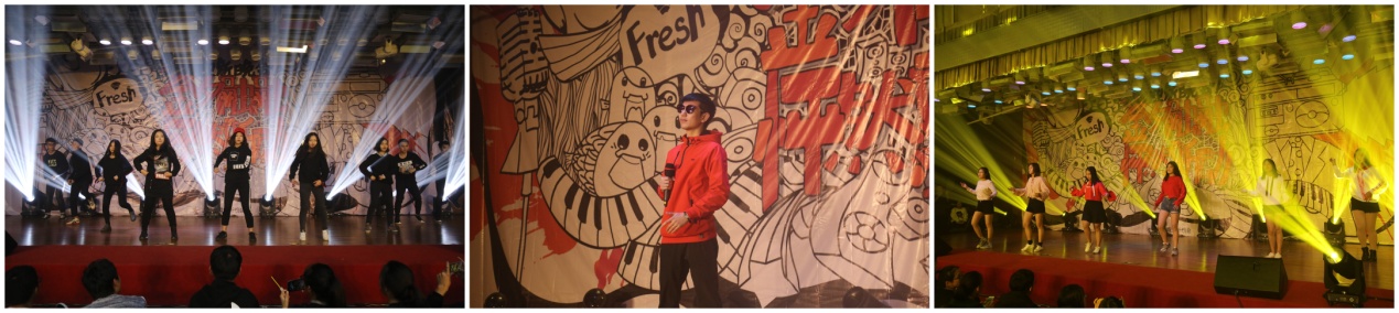 丝竹悦耳,琴瑟怡情——互金16-1的同学们带来了古风舞蹈《红尘》,叙说着滚滚红尘中,所有初遇相守的故事。柔和灯光逐渐化为跳跃的彩灯,静心聆听过后又是开怀大笑,由研究生学硕班带来的话剧《从零开始的研二生活》揭开面纱,妙趣横生又耐人寻味。随后,是金工17-2班的同学们带来的歌舞节目 《明天,你好》,展现了大一新生的朝气蓬勃和对未来的美好期望。来自金工16-2班的同学则以学长学姐的身份,献上小品《新闻联播之我们的大一》,诉说着大一的成长与收获。激情洋溢,动感澎湃,金融17-3班的舞蹈《歌舞青春》和国金16-1班的小品《金院有嘻哈》贴近青春生活,将中财学子的澎湃活力展现地淋漓尽致。