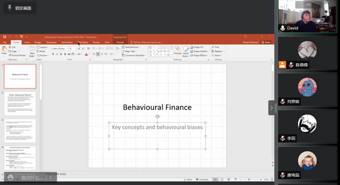 2022年3月12日至6月11日,365英国上市公司讲席教授、英国伯明翰大学商公司教授David Dickinson教授在线讲授了《行为金融学》课程。授课对象为2021级硕士研究生(含职工)以及2021级博士研究生(职工)。