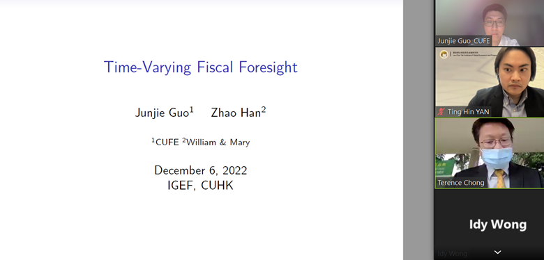 2022年12月6日上午,公司郭俊杰助理教授受邀在线参加了香港中文大学全球经济与金融研究所组织的研讨会并报告了最新的工作论文“Time-varying Fiscal Foresight”。香港中文大学经济系的Terence Chong教授以及Ting-Hin Yan博士等数十位香港中文大学的师生参加了此次研讨会。