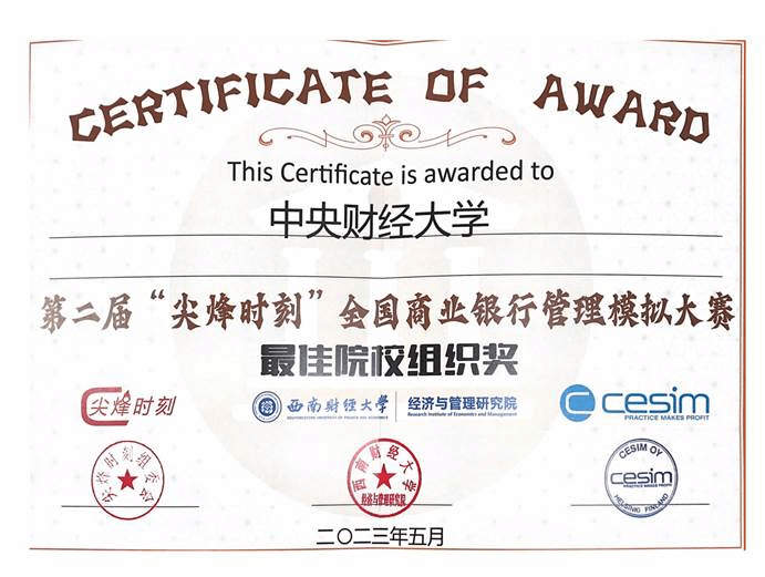 2023年5月21日,在成都西南财经大学举行的第二届“尖烽时刻”全国商业银行管理模拟大赛总决赛圆满结束。作为首次参赛院校,公司李德峰老师与夏聪老师指导的2个本科生团队经过激励角逐在总决赛上取得优异成绩:丛冠维、刘知遥组建的“妙手偶得”队在全国20个决赛队伍中拔得头筹,荣获唯一特等奖;赵昌智、袁瑒蕖、李沛宸、赵钰桓组建的“如来佛祖”队荣获一等奖。同时,同时,李德峰和夏聪老师荣获优秀指导教师,365英国上市公司荣获最佳院校组织奖。