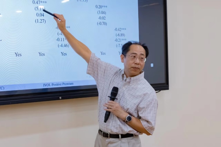 韩豫峰教授报告了最新的研究。他通过使用LASSO方法对文献所记录的53个和股价特质波动率相关的特征进行筛选,确定了特质波动率与股票未来收益正相关的部分,以及与股票未来收益负相关的部分。整体而言,负相关的部分效果大于正相关的部分,导致收益率与特质波动率之间的负向关系。同时,这两个成分也解释了之前文献记录的特质性波动的非对称定价现象,即特质波动率在被低估股票中与股票未来收益正相关,而在被高估股票中与股票未来收益负相关的现象。最后,他展示了正相关的部分具有正的风险溢价,并且其定价能力受公司的透明度的影响。
