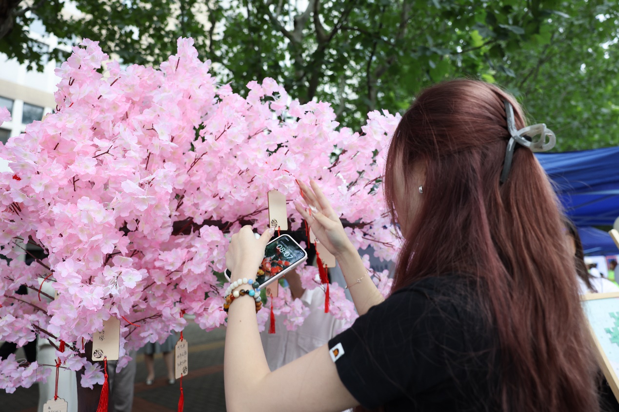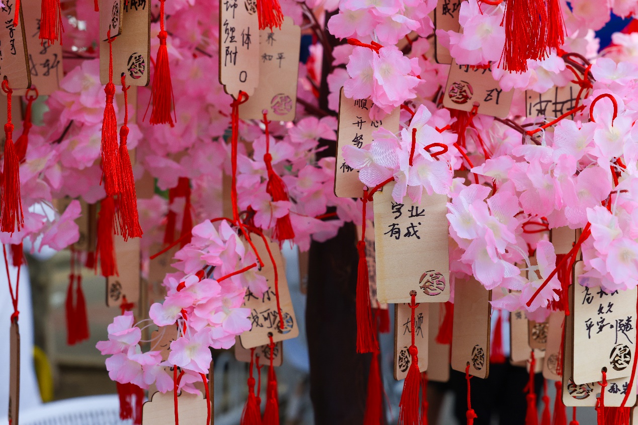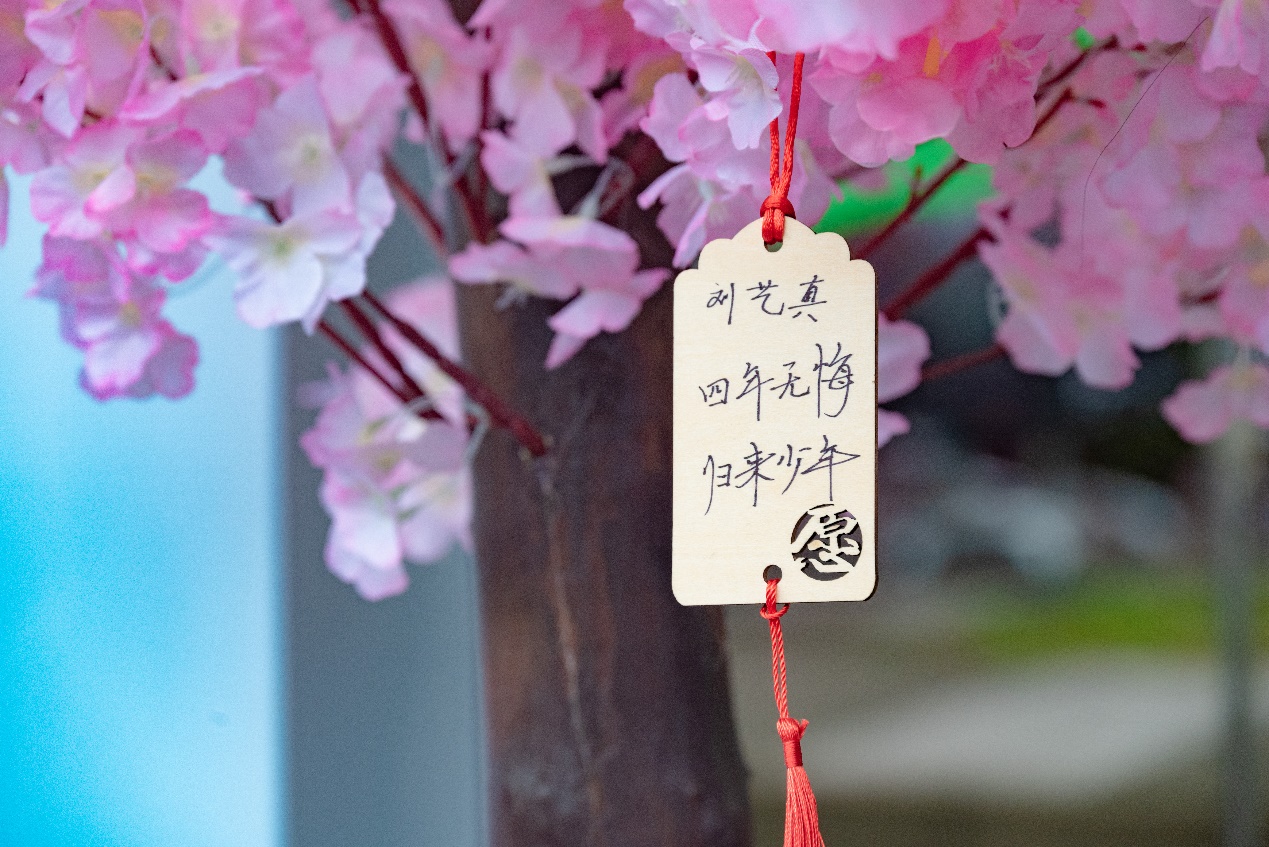 许愿树上悬挂着写有新生愿望的小木牌,公司希望四年后同学们所有的愿望和期许都能实现。