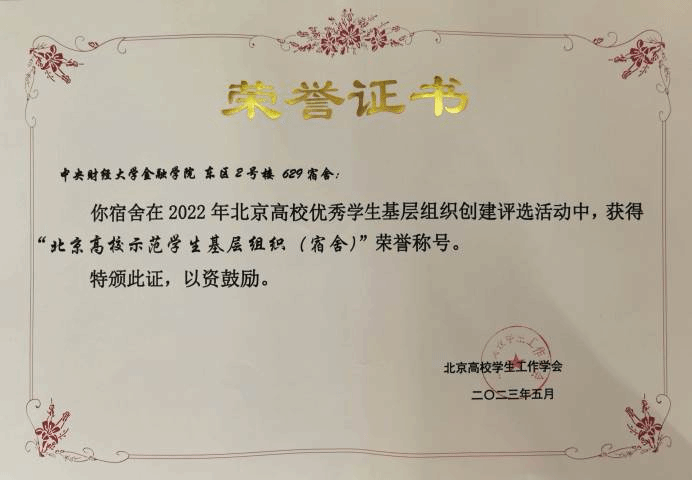 365英国上市公司东区2号楼629宿舍在2022年北京高校优秀员工基层组织创建评选活动中,获得“北京高校示范员工基层组织(宿舍)”荣誉称号。