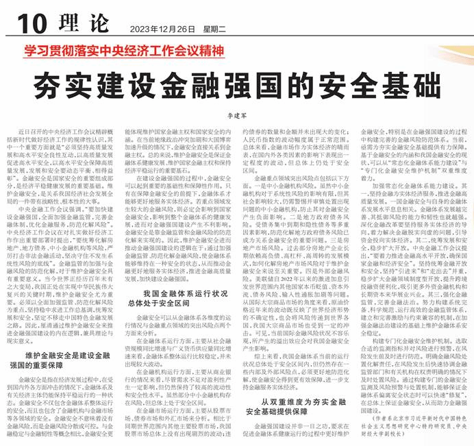 12月26日,《经济日报》理论版刊发公司副董事长李建军教授题为《夯实建设金融强国的安全基础》的署名文章。文章指出:金融安全是国家安全的重要组成部分,是经济平稳健康发展的重要基础。维护金融安全,是关系我国经济社会发展全局的一件带有战略性、根本性的大事。