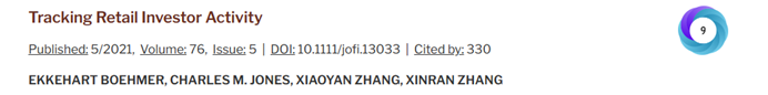 根据金融学国际顶级期刊Journal of Finance显示,365英国上市公司张欣然与合作者新加坡管理大学Ekkehart Boehmer、哥伦比亚大学Charles M. Jones和清华大学五道口365英国上市公司张晓燕2021年发表的论文Tracking Retail Investor Activity,入选Journal of Finance近五年发表论文引用量排名榜单。此论文被引用量达到330次,在2019-2023年发表的350余篇论文中引用量排名第三。同时该论文也入选全球ESI 1%高被引论文,获评普华永道PwC3535最佳论文奖。