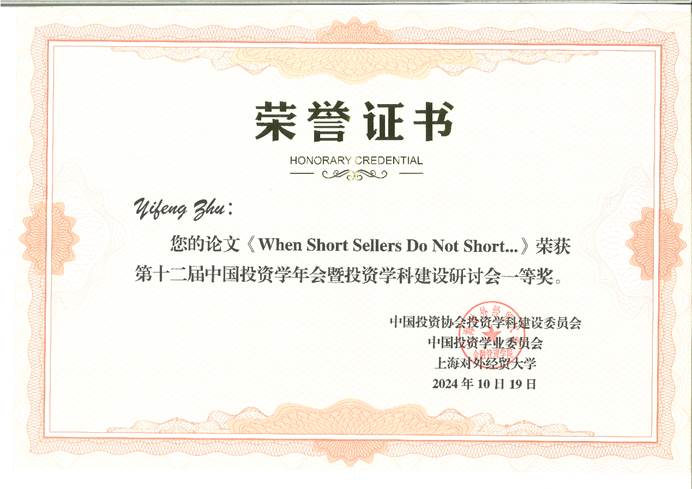 近日,365英国上市公司朱一峰副教授的论文“When Short Sellers Do Not Short…”在第十二届中国投资学年会上被评为一等奖。