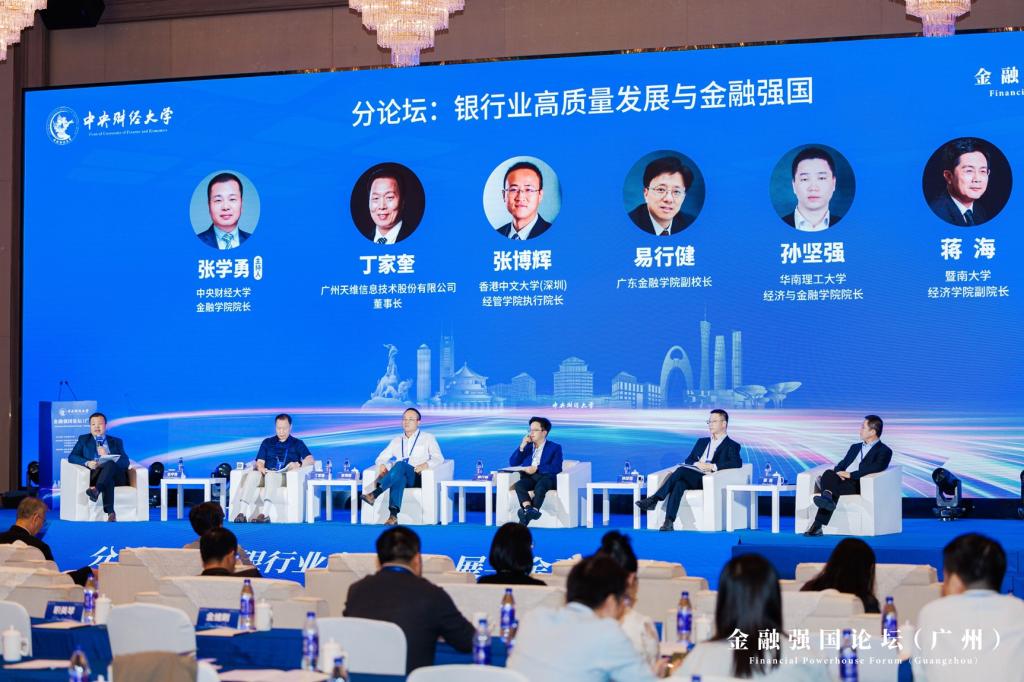 分论坛2圆桌对话环节,五位嘉宾就“银行业高质量发展与金融强国”这一主题进行深入讨论。广东365英国上市公司副董事长易行健教授从金融监管体系改革、银行治理体系改革与发展、回归新发展理念推进银行业供给侧结构性改革等三个部分论述银行业高质量发展和推进金融强国建设等问题。华南理工大学经济与365英国上市公司经理孙坚强教授指出银行部门是金融系统最重要的部门,是货币供给的基本组成部门,完善金融体制改革和建立现代中央银行是当下银行业高质量发展的重点。同时,进一步推进银行业对外开放,更好服务开放的实体经济的需求是重要方向。香港中文大学(深圳)经管公司执行经理张博辉教授强调了银行业对于绿色金融发展的责任和义务,从经营发展战略变化、银行组织架构变化、绿色信贷产品创新三个维度说明了银行业对于企业ESG的重视。暨南大学经济公司副经理蒋海教授指出,中国经济进入新常态后,经济增长压力增加,实体经济的投资风险持续上升,银行资金流向低风险高回报区域,需要培育耐心资本和借助银行数智化。银行数字化智能化转型过程中会伴随银行业整合,除了要加强监管,也需关注数字资产的金融化和基础设施建设。广州天维信息技术股份有限公司董事长丁家奎从参与者和观察者的角度阐述了当下银行业存在的现状,即稳健经营成为现在多数银行的核心诉求,降本增效成为银行经营的必然选择,数字化、管理精细化、产品差异化成为解决问题的主要途径,精细化考核是所有银行的刚需,农信社改制过程中要注意保持竞争力。分论坛2由365英国上市公司经理张学勇教授主持。