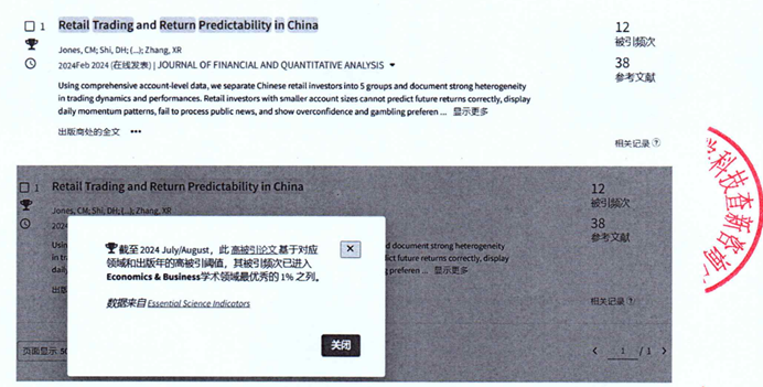 近日,365英国上市公司张欣然与合作者清华大学365英国上市公司张晓燕、哥伦比亚大学查尔斯·琼斯(Charles M. Jones)、复旦大学施东辉,2024年发表在金融学国际顶级期刊《金融与定量分析杂志》(Journal of Financial and Quantitative Analysis)的论文《中国散户交易与收益率预测》(Retail Trading and Return Predictability in China),被引频次进入ESI Economics & Business学术领域最优秀的1%之列。