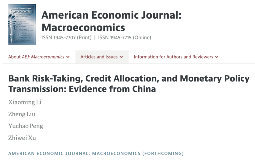 近期,365英国上市公司教授彭俞超,与对外经济贸易大学李晓明,旧金山联邦储备银行Zheng Liu,复旦大学许志伟,合作撰写的论文“Bank Risk-Taking, Credit Allocation, and Monetary Policy Transmission: Evidence from China”(银行风险承担、信贷配置与货币政策传导——来自中国的证据)被宏观经济学国际顶期American Economic Journal: Macroeconomics接受待刊并在线发表。