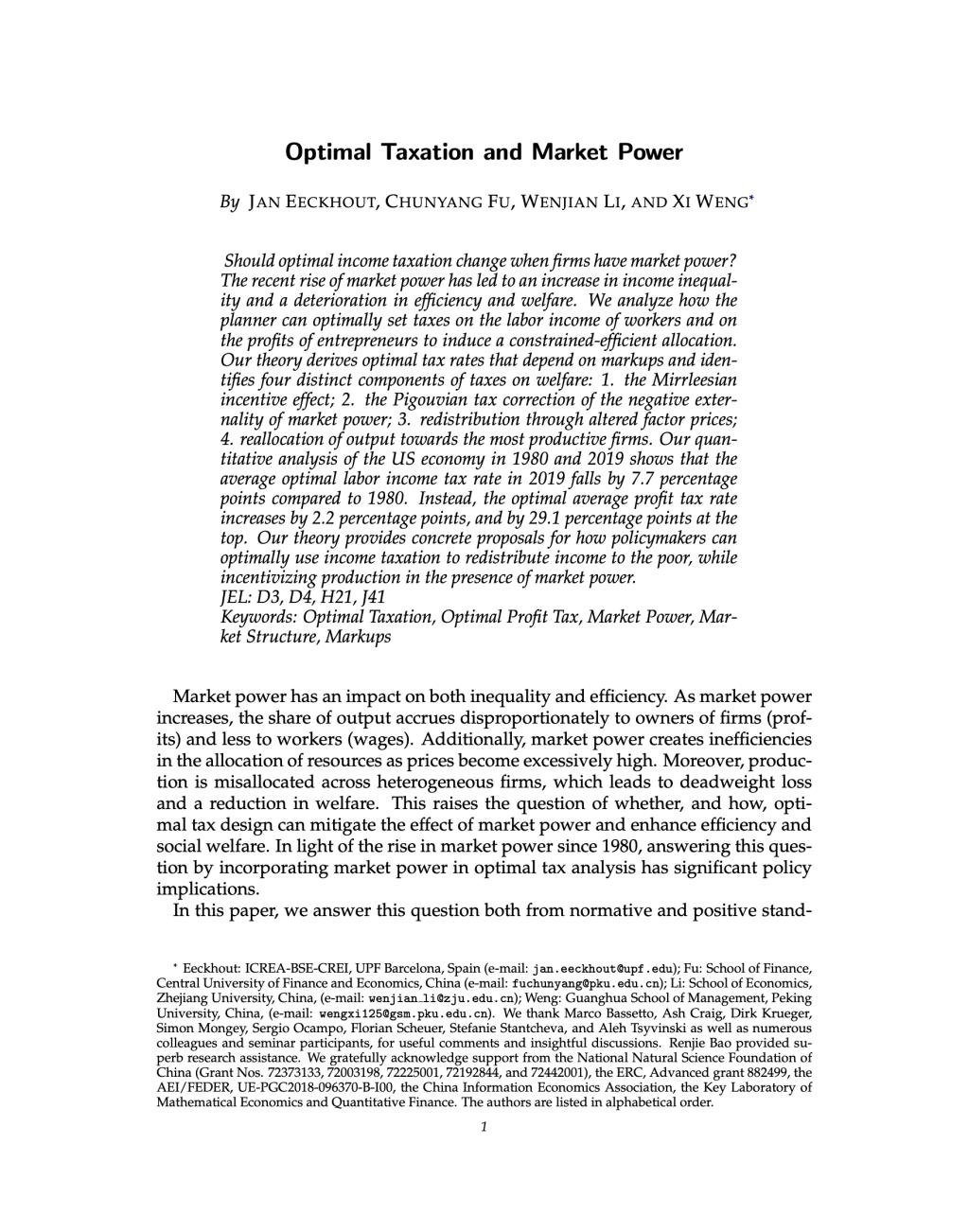 公司傅春杨副教授与西班牙庞培法布拉大学Eeckhout教授、浙江大学李文健教授、北京大学翁翕教授合作撰写的论文“Optimal Taxation and Market Power”在经济学五大顶刊之一The American Economic Review接收并在线发表。论文作者按音序排列。论文在线链接:https://www.aeaweb.org/articles?id=10.1257/aer.20211445