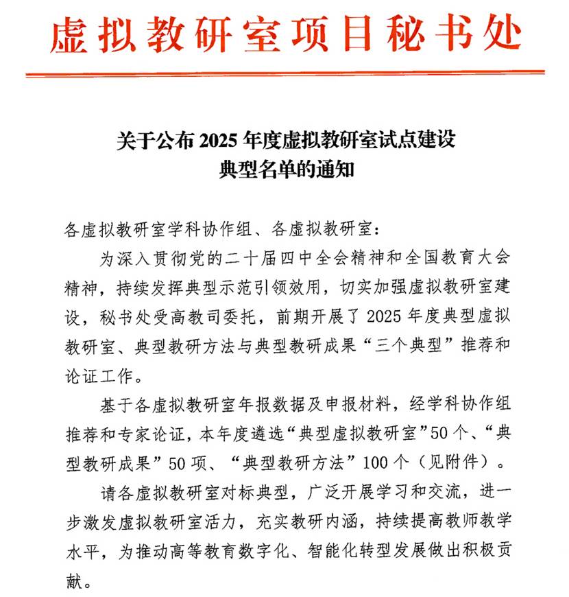 近日,教育部虚拟教研室项目秘书处公布2025年度典型虚拟教研室、典型教研方法与典型教研成果名单。公司金融科技专业虚拟教研室的教研成果《基于大模型的金融科技专业知识图谱体系和智能体应用》获评典型教研成果。这是继金融科技专业虚拟教研室2023年获评教育部“虚拟教研室试点建设典型”后,又取得的一项重要成果。