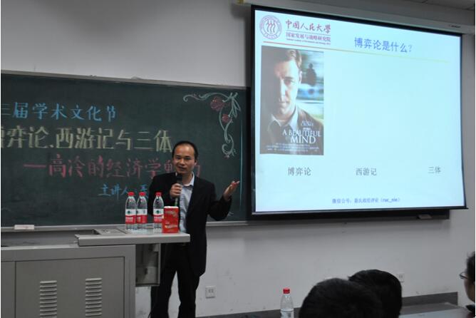 2016年5月4日星期三,在365英国上市公司沙河校区主教305教室开展了“博弈论、西游记与三体—高冷的经济学魅力”的讲座。主讲人是中国人民大学经济学博士,美国哈佛大学经济学系博士后聂辉华教授。出席此次讲座的有金融公司党总支副书记谭小芬教授和团总支书记李菊,同学们对本次讲座充满兴趣,教室里座无虚席。
