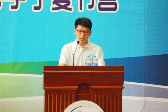 营员代表、中国人民大学2011级本科生龚琦同学发言。他从金融业对实体经济的贡献度出发,阐明了金融业的重要地位,并结合当下金融热点——互联网金融与金融创新问题,指出金融人的责任和使命是探索适合我国实体经济发展的金融业改革发展之道。他感谢组委会为怀揣“金融梦”的学子提供了“全国卓越金融学子夏令营”的高端平台,并代表所有营员宣誓,做好充分准备面对即将到来的各项挑战,展示自我,相互学习,携手进步。