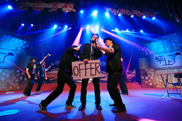 10级金融1班的节目《来自土星的你》率先引发了晚会的第一次高潮,带动了全场的气氛。他们的话剧来源于热播韩剧《来自星星的你》,结合老员工活时的校园故事,让观众朋友们在快乐的气氛中仿佛看到自己大学影子。