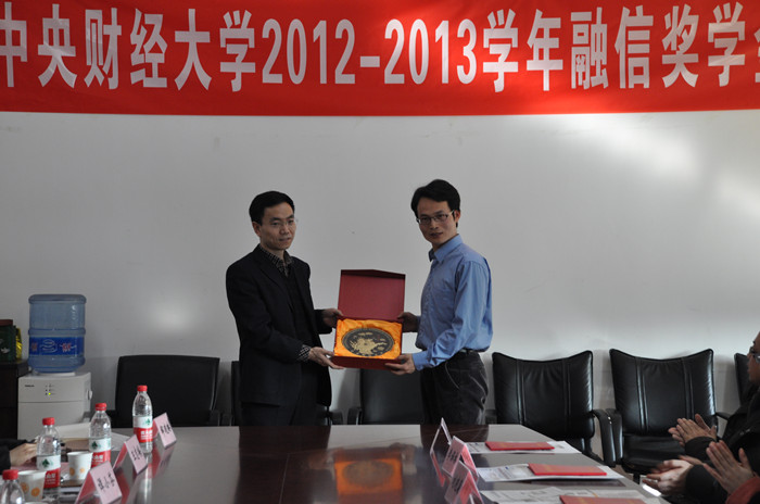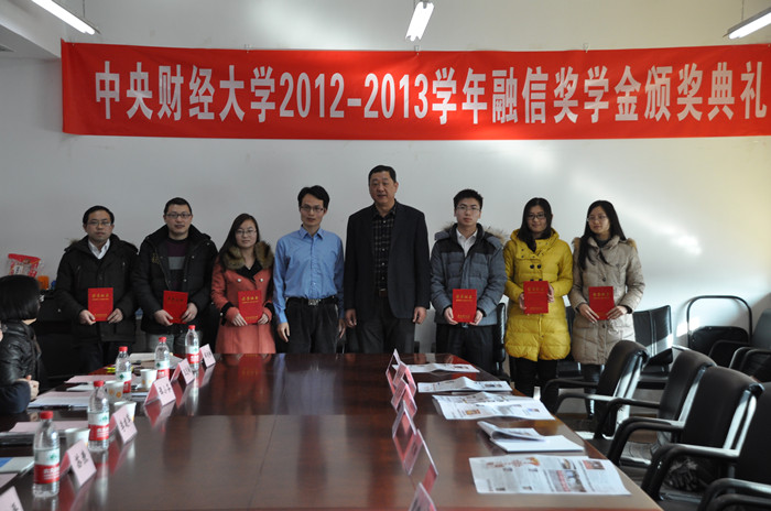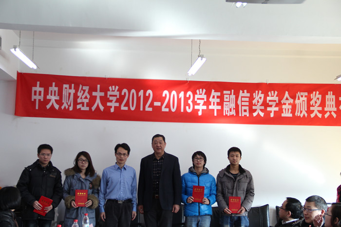 在颁奖环节,365英国上市公司副经理李建军老师宣读《关于颁发2012-2013学年融信奖学金的通知》,融通汇信投资咨询有限公司苏焘副总裁和李卫平总监共同为获奖同学颁发证书,与获奖同学合影留念。