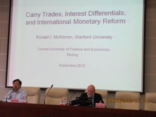 接着,麦金农教授开始了长约一个半小时的讲座。麦金农教授首先指出近年来重大金融事件产生的一系列问题。2008年美国的次贷危机引发的经济危机、欧债危机等,对全球金融市场造成了很大的冲击。而2002年至2008年与2009年至今两个阶段的套利交易也有显著不同。其次,麦金农教授指出发达经济体与新兴市场利差的存在引起了套利交易。尽管2008年美国次贷危机对套利交易产生了冲击,但由于发达经济体利率接近于零,而新兴市场利率相对较高,套利依然存在,热钱流动迅速,对此麦金农教授分别为发达经济体与新兴市场提出了政策建议。同时,麦金农教授指出中国的金融业在银行制度,与金融市场等多方面与发达国家相比还存在一定的差距,仍需多方面不断发展与完善金融体系。在讲座中,麦金农教授提出了很多与传统理论不同甚至相反的观点,他认为教科书式的“三角不可能定理”在现实中并不成立。针对当前的经济萧条,他认为美联储应该提高利率水平,避免流动性陷阱问题。针对中国经济,他一如既往的认为中国应该实行盯住美元的汇率制度。麦金农教授提出的这些新颖的观点给听众带来了极大的智力冲击。