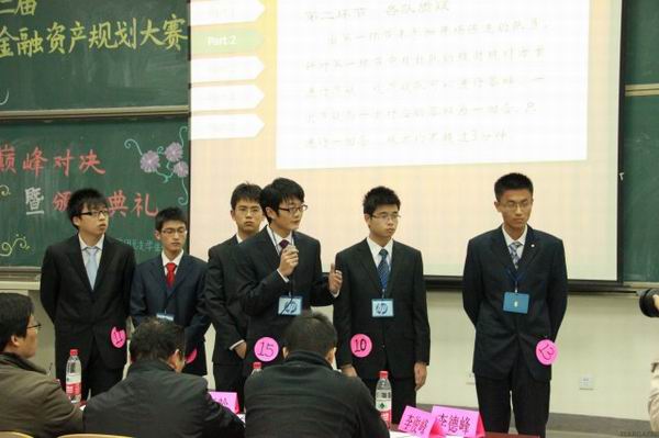 第二届金融资产规划大赛前后历时一个多月,共吸引了 400 多名参赛者,在经历过理论知识选拔赛、模拟企业交流会、资产规划书撰写等环节后,最终共 5 支队伍杀入本次决赛。决赛的第一个环节——资产规划书陈述。各个团队从财务和市场角度介绍了所代表公司的现状,并在此基础上为公司量身制定了资产规划方案,最后针对方案进行了风险管理和可行性分析。各个团队的陈述方式不尽相同,各具特色。无论是制作精美的 ppt ,还是丰富充实的内容介绍,无论是激情洋溢的陈词,还是别出心裁的展示形式,都让评委和同学们眼前一亮。比赛的第二环节由各队进行相互质疑。比赛的现场,随即弥漫起紧张的氛围。双方辩驳激烈,各不相让,伯仲之间,难分上下。第三环节为陈述环节。在短短的 3 分钟内,团队的代表尽量用最具逻辑,最精炼的语言将自己的想法表达出来,紧凑但不失精彩,简洁但不乏生动。第四环节为现场互动环节。团队成员们针对观众的提问进行耐心而详细的解答,互动氛围十分融洽。
