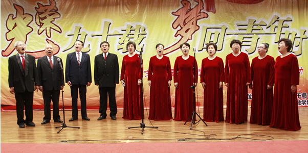 在之后的文艺表演中,老干部们展演了精彩纷呈的节目。舞蹈《和谐中国》向我们彰显了五十六个民族团结向上、开拓奋进的和谐形象;红歌《跟着共产党走》、《江山》高亢有力的歌声久久在舞台上回荡,将同学们带回了那个激情燃烧的岁月;诗朗诵《鲜红的党旗》展现了老干部们老当益壮、志在千里的豪情;尹世昌爷爷还饱含激情地讲述了他亲身经历开国大典时的感受。老干部们用美妙的舞姿、动听的歌声和雄浑有力的朗诵彰显了他们吃苦耐劳的奉献精神、不懈奋斗的刚强意志,向我们诠释了宝刀不老、青春永驻的真正含义。