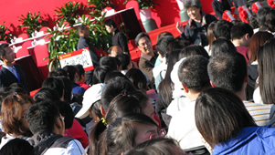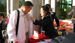 早晨 8:00 ,员工们陆续返校,公司签到台前欢声笑语一片,签到、领取材料、佩戴校徽,气氛热烈而有序,多年未见的同学、师生纷纷相拥,共叙同学谊、师生情。据不完全统计,公司此次返校参加校庆活动的员工约有九百余人。