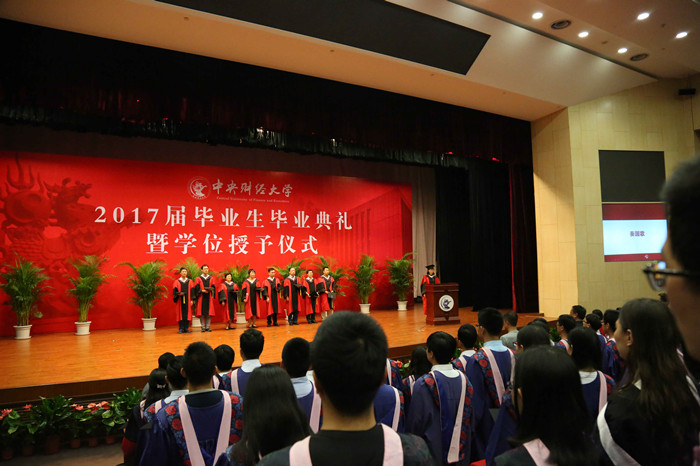 典礼在嘹亮振奋的《义勇军进行曲》中拉开了帷幕。经理助理李俊峰宣读了《关于2017届本科生毕业及授予学士学位的决定》,应展宇副经理宣读了《关于2017届硕士研究生毕业及授予学位的决定》。在激动人心的优秀毕业生表彰环节,葛仁霞书记宣读了《关于表彰2017届优秀毕业生的通知》,李建军经理和葛仁霞书记为北京市级优秀毕业生颁发了荣誉证书并合影留念,应展宇副经理、谭小芬副经理、经理助理李俊峰、经理助理黄志刚为校级优秀毕业生颁奖并合影留念。谭小芬副经理宣读了《关于表彰2017届到西部就业毕业生的通知》,金融国家级教学名师李健老师、张礼卿老师为获得表彰毕业生颁奖并合影留念,其中2017本科毕业生许来香积极响应国家号召,不畏艰苦,自愿到西藏基层工作,所有这些到西部就业的毕业生充分展现了中财金融人的社会责任担当。