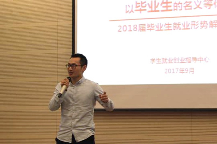 会议伊始,员工就业创业指导中心就业创业信息管理与服务办公室副主任邸飞从就业情况、就业形势、就业准备、求职经验四部分给同学们做出全面指导。首先,邸飞老师结合就业地域流向和就业行业分布这两大中心问题介绍了2017届毕业生就业情况,并建议同学们也要关注京外和非金融机构的就业机会。随后,邸飞老师通过近三年毕业生人数的比较,客观分析了同学们即将面临的就业形势,建议同学们掌握好校园招聘的节奏,把握10月-11月份求职的黄金期。之后,邸飞老师从求职方式、求职渠道、相关材料准备等方面告知同学们应该如何积极“备战”。同时,还分享了一些求职经验,他指出越努力越幸运,同学们要积极投简历;要目标明晰,确定合理期望。他相信“宝剑锋从磨砺出,梅花香自苦寒来”,只要同学们不懈努力,一定能找到心仪的工作。