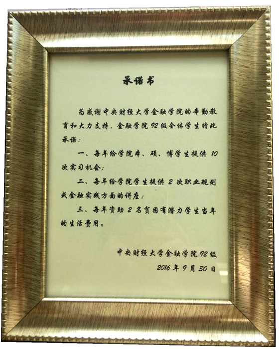 最后,为感谢公司的辛勤培养和表达对公司人才培养的炽热情怀,卫剑波同学代表92级本科员工们在座谈会上宣读了集体承诺书,承诺每年为学弟学妹提供十次实习机会、提供两次职业规划或金融实践方面的讲座、资助两名贫困有潜力同学当年的学费。承诺完毕,92级员工们还向公司和老师们赠送了精美礼物,并与公司领导、老师合影留念。