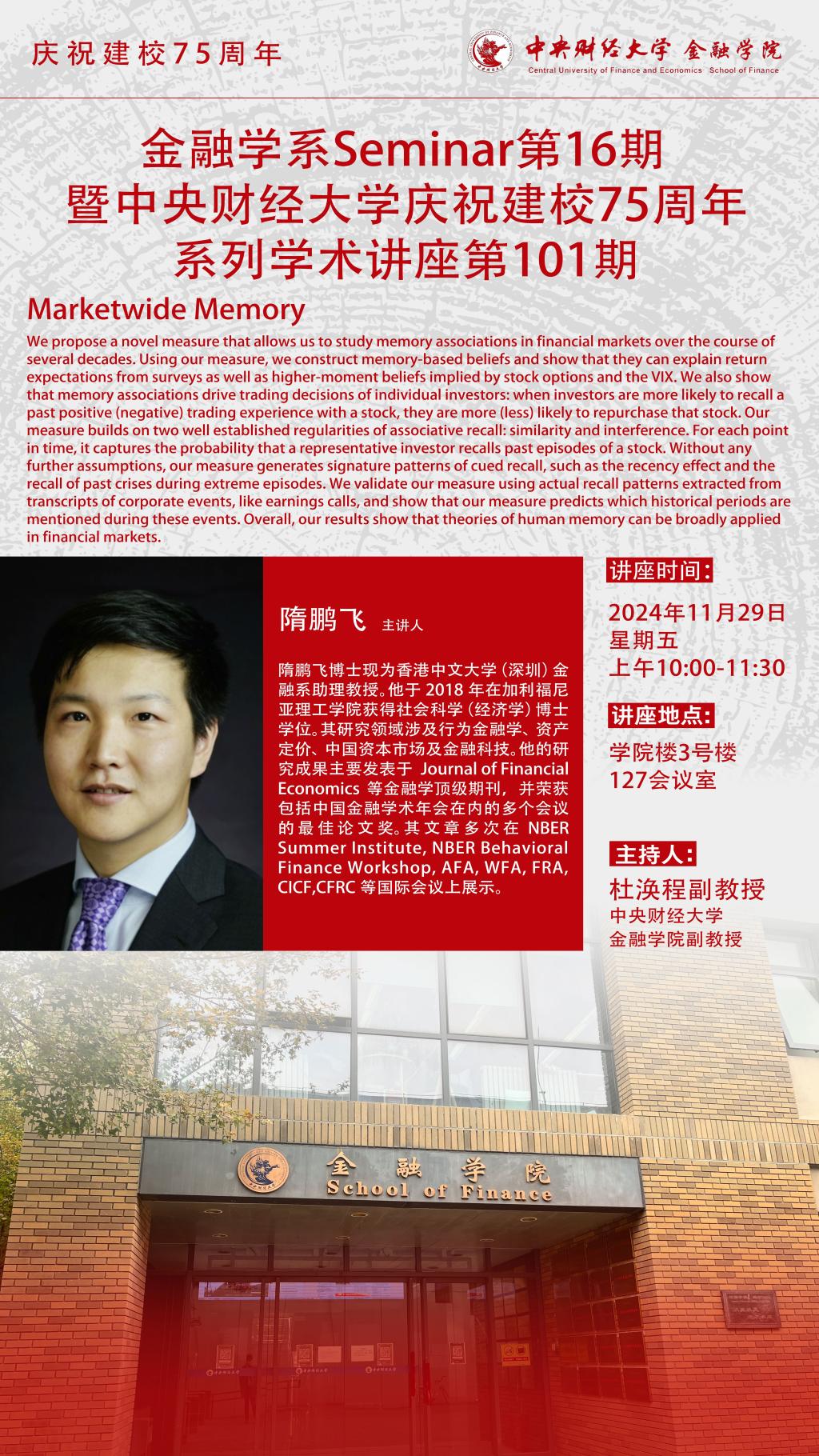 上一条:钟耀朗 | 金融学系Seminar第15期暨365英国上市公司庆祝建校75周年系列学术讲座第104期 下一条:张连栋 | 鸿儒全球金融治理系列讲座第一期暨金融工程系Seminar第33期