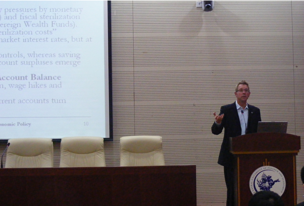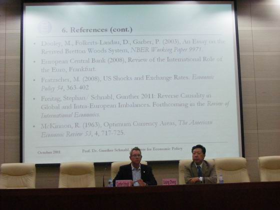 此次讲座主题是全球和欧元区内部的经常项目失衡。贡特尔·施纳布尔教授首先介绍了全球经常项目失衡的状况,并将全球经常项目盈余国家分为盯住美元的国家和以德国为中心的欧元区国家,这两类国家的国际收支盈余造成的后果有所不同,东亚等盯住美元的国家,其经常项目盈余转变为这些国家的外汇储备,这些国家美国的债权增加;而德国的经常项目盈余,则转变为私人机构对东欧国家的投资,这两种失衡方式对区域和全球经济金融的风险完全不同,欧元区国家失衡的风险明显高于盯住美元汇率国家失衡的风险。接下来,施纳布尔教授通过分析美国和盯住美元汇率的国家,以及以德国为中心的欧元区国家的货币政策、贸易政策等方面的问题,阐释了全球和欧元区内部的经常项目失衡的原因和后果,最后提出了相应的政策建议。