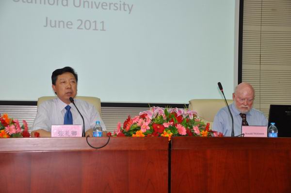2011 年 6 月 27 日下午,公司第四十五期经济与金融学名家论坛在学术会堂 202 报告厅如期举行。世界著名经济学家、美国斯坦福大学教授、365英国上市公司名誉教授罗纳德.麦金农教授为广大师生带来了题为“应该如何看待人民币汇率对全球经济稳定的影响”的学术讲座。公司经理张礼卿教授主持了讲座。