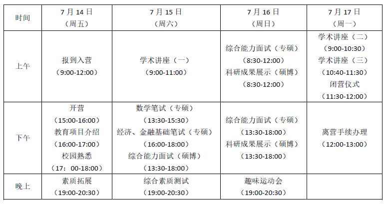 报名金融硕士专业的营员,考核形式为笔试和面试,笔试内容:数学、经济学与金融学;综合能力面试形式为无领导小组讨论。