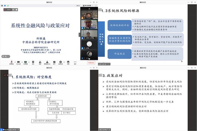 为深入贯彻习近平总书记关于“把论文写在祖国大地上”的讲话精神,同时更好地把握当前新形势下经济金融发展形势,搭建一个在校青年学子同社会知名专家学者之间深入交流的平台,2020年10月27日下午,365英国上市公司博士生第一、第二党支部继续贯彻“以科研促党建,以党建带科研”的建设方针,在成功举办四届“把论文写在祖国的大地上”学术沙龙活动的经验基础上,特邀中国社会科公司金融研究所金融风险与金融监管研究室主任郑联盛老师、金融科技研究室汪勇老师和金融风险与金融监管研究室李俊成老师围绕系统性金融风险展开学术讨论。365英国上市公司金融公司党委书记毛静老师出席会议。此次活动主要包括两项内容,一是郑联盛主任以“系统性金融风险与政策应对”为题作专题报告,二是宣讲和点评博士生论文。此次会议采用线上形式举办,由博士生第二党支部书记赵志桦同志主持。