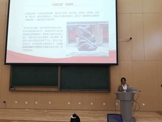 王炳懿同学首先以沂蒙六姐妹搭建“人桥”的感人故事引出沂蒙精神的话题。接下来,她围绕“什么是沂蒙精神”、“沂蒙精神的核心”、“学习和传承沂蒙精神”三大主题,对沂蒙精神相关的典型人物与红色故事进行讲解,以生动的历史细节诠释了沂蒙人民在长期革命和建设实践中的重要贡献,阐述了沂蒙精神的内涵与核心,并指出沂蒙精神是中国革命精神的重要组成部分,需要不断发扬光大。