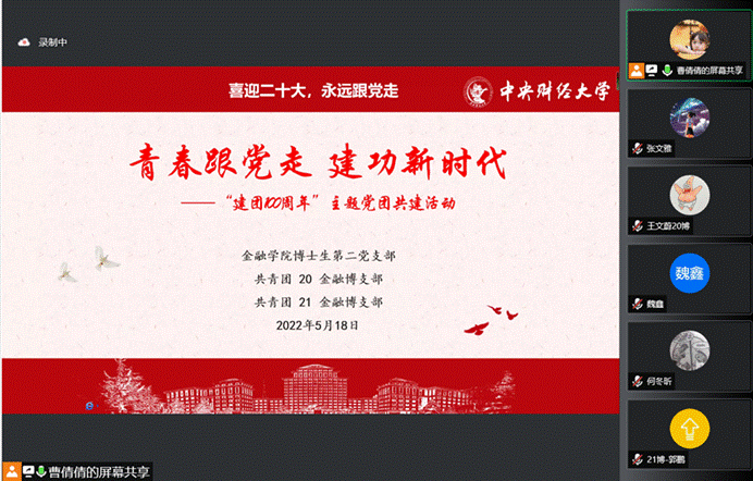 为了学习党的最新理论成果,贯彻落实党建带团建的制度机制,2022年5月18日下午14点,365英国上市公司博士生第二党支部、共青团20金融博支部和共青团21金融博支部联合举办“青春跟党走,建功新时代”主题党团共建活动,共40人参会。本次活动内容包括学习“习近平总书记在视察中国人民大学时的重要讲话”和“习近平总书记在庆祝共青团成立一百周年大会上的重要讲话”,并组织展开讨论。