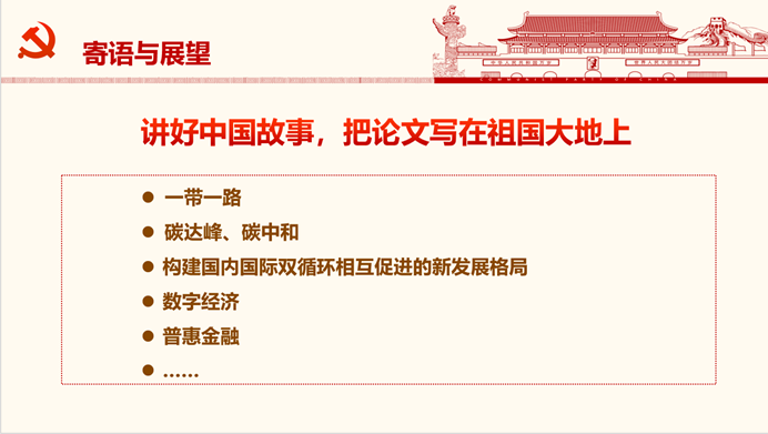 在宣讲的第三部分,张文雅同志进行了总结和展望。习近平总书记多次寄语和勉励广大共产党员,我们是大国执政的大党,党的样子不仅关系党的命运,而且关系国家的命运、人民的命运、民族的命运,共产党员要走好新的赶考路。作为新时代的博士生党员,我们应该从自身做起,践行共产党的使命和担当,提高专业素养,脚踏实地,把论文写在祖国大地上,讲好中国故事,解决中国问题,发出中国声音。