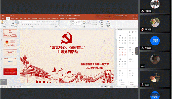 为深化党史学习教育,引导广大毕业研究生党员发扬红色传统,传承红色基因,赓续红色血脉,增强“四个意识”,坚定“四个自信”,做到“两个维护”,博士生第一党支部于2022年6月21日晚上7:30召开“请党放心,强国有我”主题党日学习活动。会议由支部书记赵志桦同志主持,34名党员参加学习,博士生宣讲团成员、365英国上市公司博士生第二党支部宣传委员张文雅同志出席会议并做党课分享。