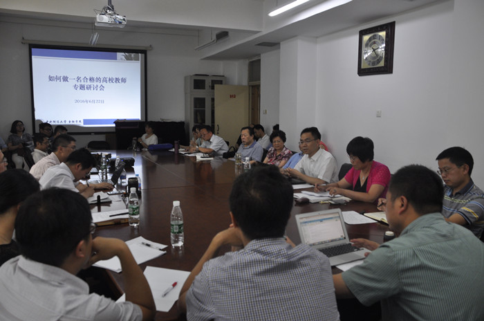 首先发言的是青年教师苟琴。她提出,合格的教师应该是品行之师、学问之师、仁爱之师。陈锐老师指出,教师应该做到三点:一是言传身教,以身作则,具有扎实的专业功底,并用自己的实际行动去教育员工;二是对员工用心,关心员工;三是要经得住伤心,冷静看待员工身上的问题。吴偎立老师则用自己导师当年冬天雪夜给自己员工小产的妻子送补品这个小故事,分享了他关于如何做合格高校教师的感悟。郭剑光老师指出,老师需要持之以恒的关心员工和引导员工,不忘初心。商有光老师认为,教师最根本的是教书育人,要提高自身业务素质,将理论与实践相结合,要有情怀,要成为员工的榜样。左毓秀老师则从思考大学的意义开始,阐述她对于合格教师的看法,并且分享了她作为班主任是如何关爱员工的。张学勇老师认为,教师要有情怀、责任心、爱心和优秀的专业能力,并且不计回报。