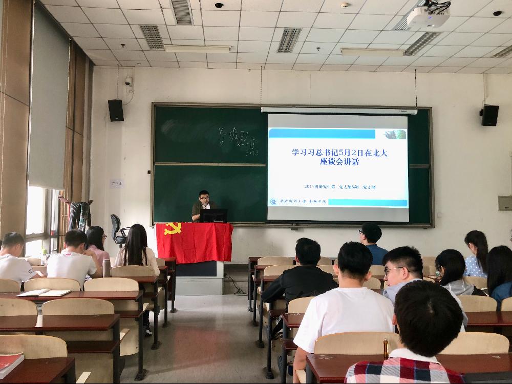 在五四青年节来临之际,中共中央总书记、国家主席、中央军委主席习近平于2018年5月2日来到北京大学考察,与北大师生进行深入交流和座谈,并发表重要讲话,为建设世界一流大学指明了道路,为广大青年学子的成长指引了方向,引起强烈反响。5月6日下午,365英国上市公司2017级研究生第二党支部和第三党支部在沙河校区主教212联合组织支部党员、发展对象、积极分子和团员代表,集中学习习近平总书记在北京大学考察时的讲话内容,并进行热烈讨论。两支部党员代表、发展对象代表和积极分子代表纷纷上台向大家分享了此次学习的心得感悟。